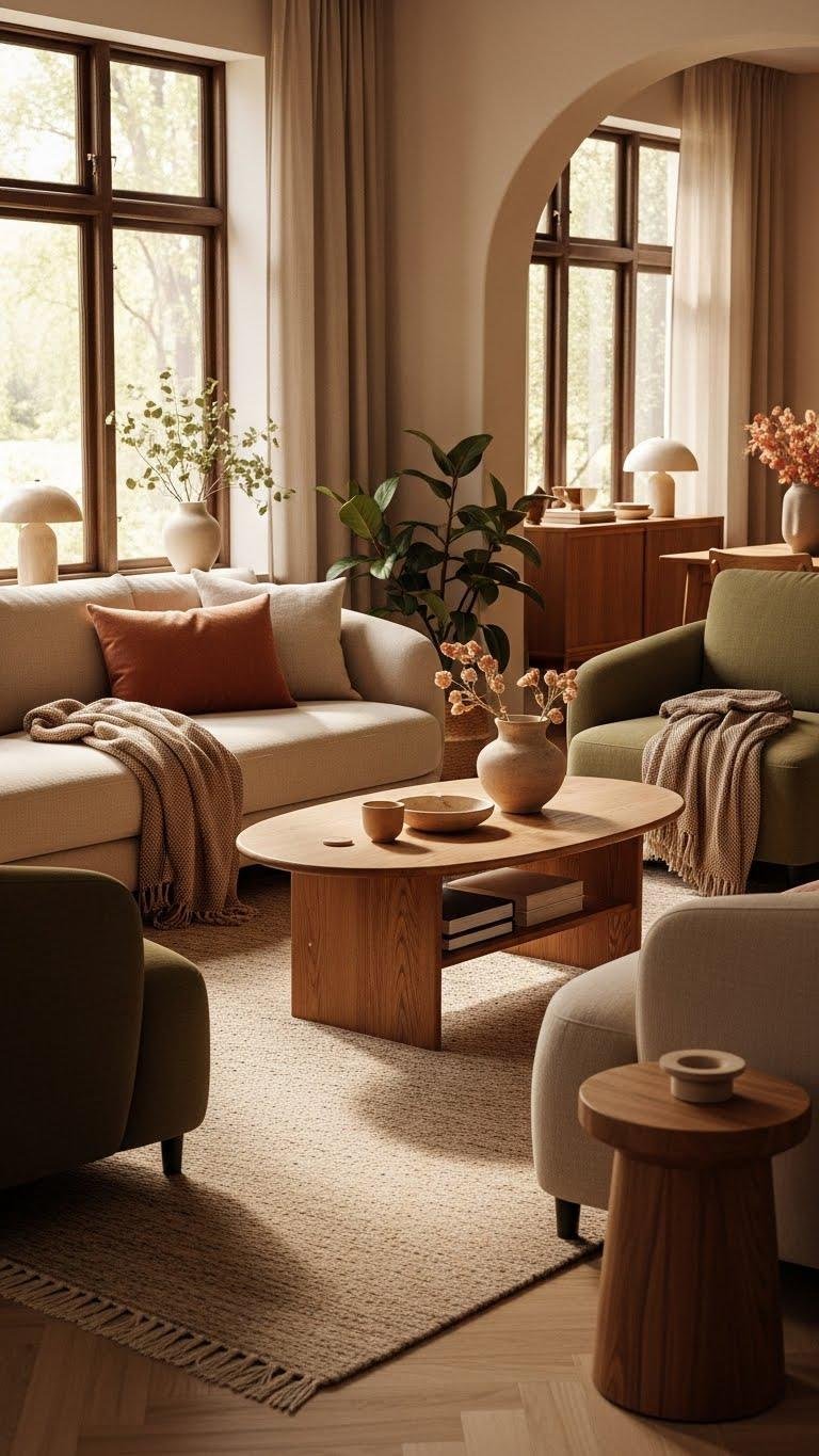 You’ll cultivate neutral warmth through sandy linens, soft beiges, and wood tones, then introduce muted terracotta as an anchoring accent.