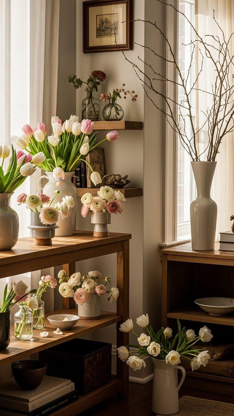 Often a single vase can transform an entire room, so choose blooms that echo your apartment’s palette and scale—think spring tulips for crisp modern spaces, ranunculus for soft, layered looks, or tall branches for high-ceilinged rooms. Mix vintage budvase arrangements across shelves, rotate seasonal stem swaps weekly, and let scent, silhouette, and effortless placement create a lived-in, free-spirited bloom display.