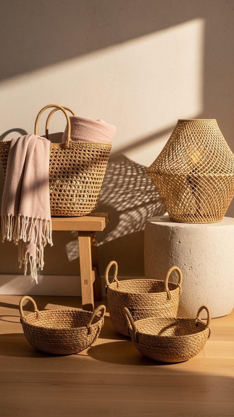 You’ll layer a woven lamp basket as a statement or tuck blankets into a low market tote for easy access. Mix natural fibers, open weaves, and sculptural handles to keep things airy, organized, and effortlessly free-spirited.