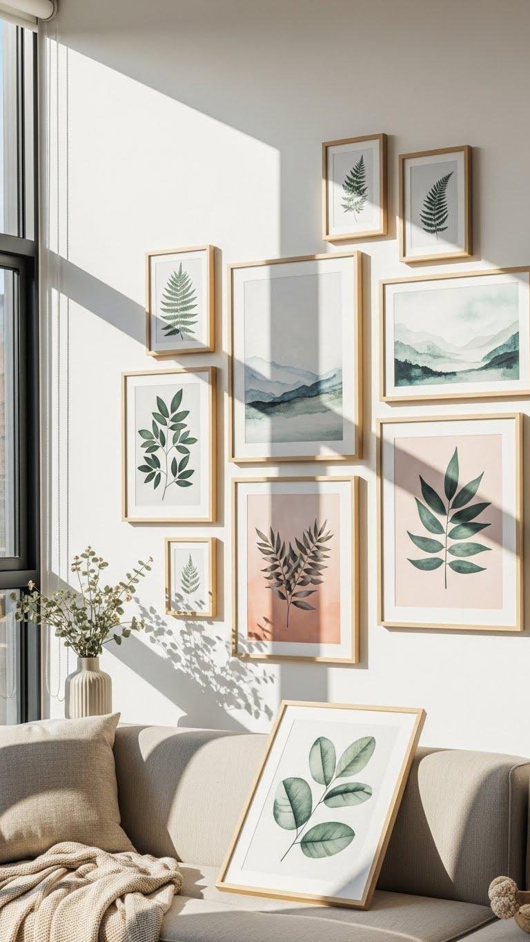 Want to welcome spring into your apartment with art that feels as fresh as the air outside? Rotate artwork to light, nature-themed pieces: swap heavy canvases for botanical prints and airy watercolors, or install rotating frames to cycle seasonal favorites. You’ll invite sunlight, calm, and a liberated vibe — choose bold foliage, soft palettes, and asymmetrical arrangements for a modern, carefree refresh.
