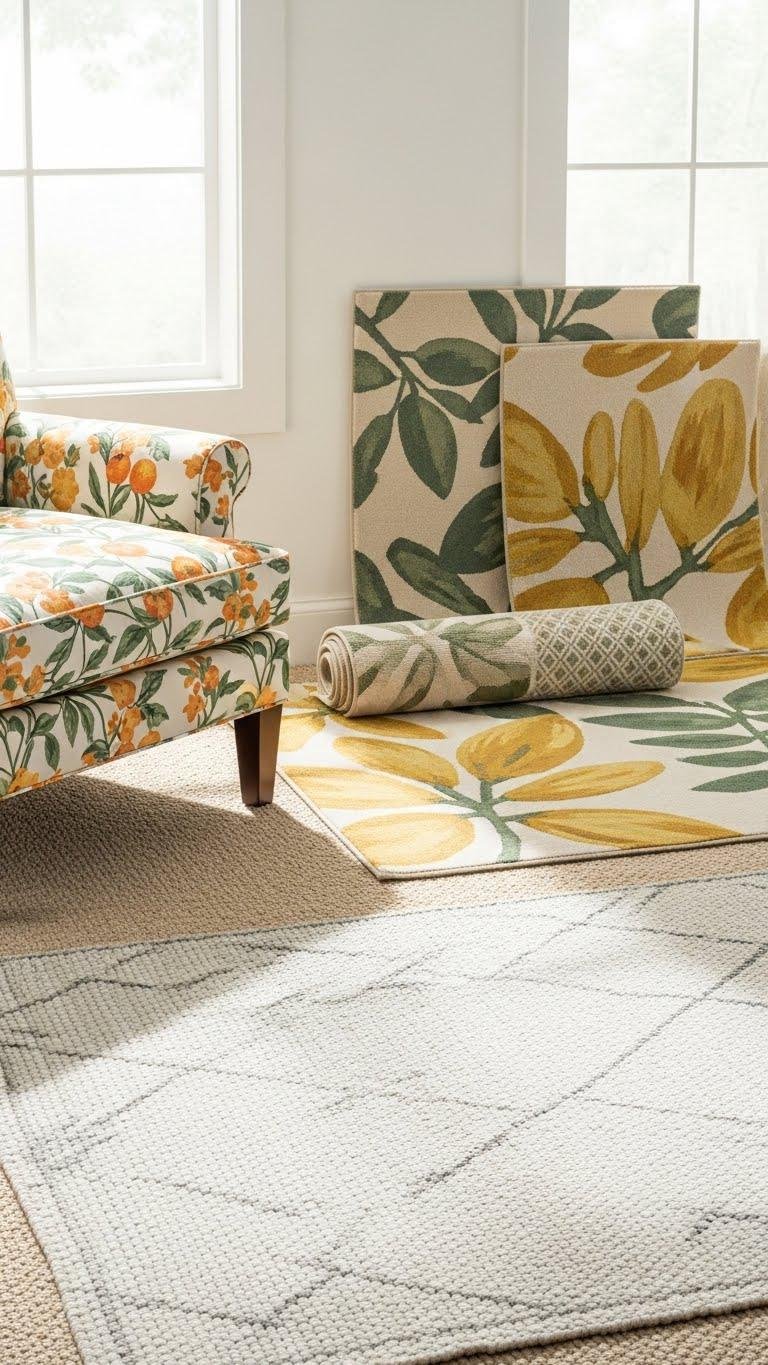 After you’ve anchored a corner with a floral or citrus chair, lighten the floor to match by swapping out dense, dark rugs for airier patterned options that keep the room feeling open and spring-ready.
