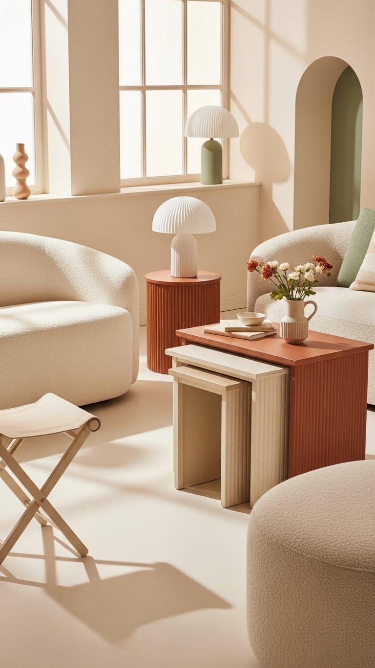 Pick folding stools for pop-up seating and nesting tables that stack or scatter as needed. You’ll create airy, adaptable vignettes that follow your mood and make small-space living feel effortless and free.