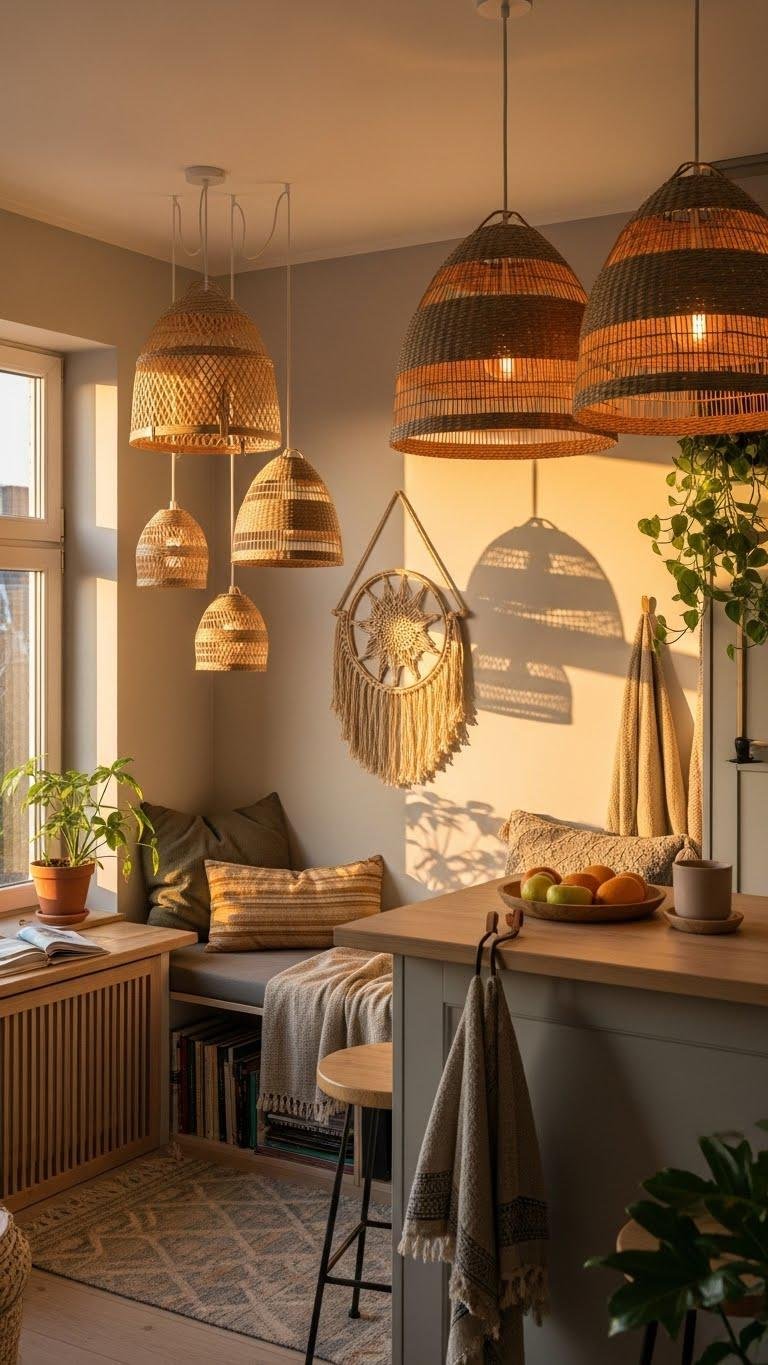 Something as simple as a woven pendant can instantly warm a room and introduce organic texture without overwhelming a small apartment. Choose bamboo pendants or rattan shades to create breezy, layered light that feels both modern and relaxed. Hang them over a reading nook or kitchen island, mix sizes for movement, and let natural fibers anchor your space while keeping it airy and free.