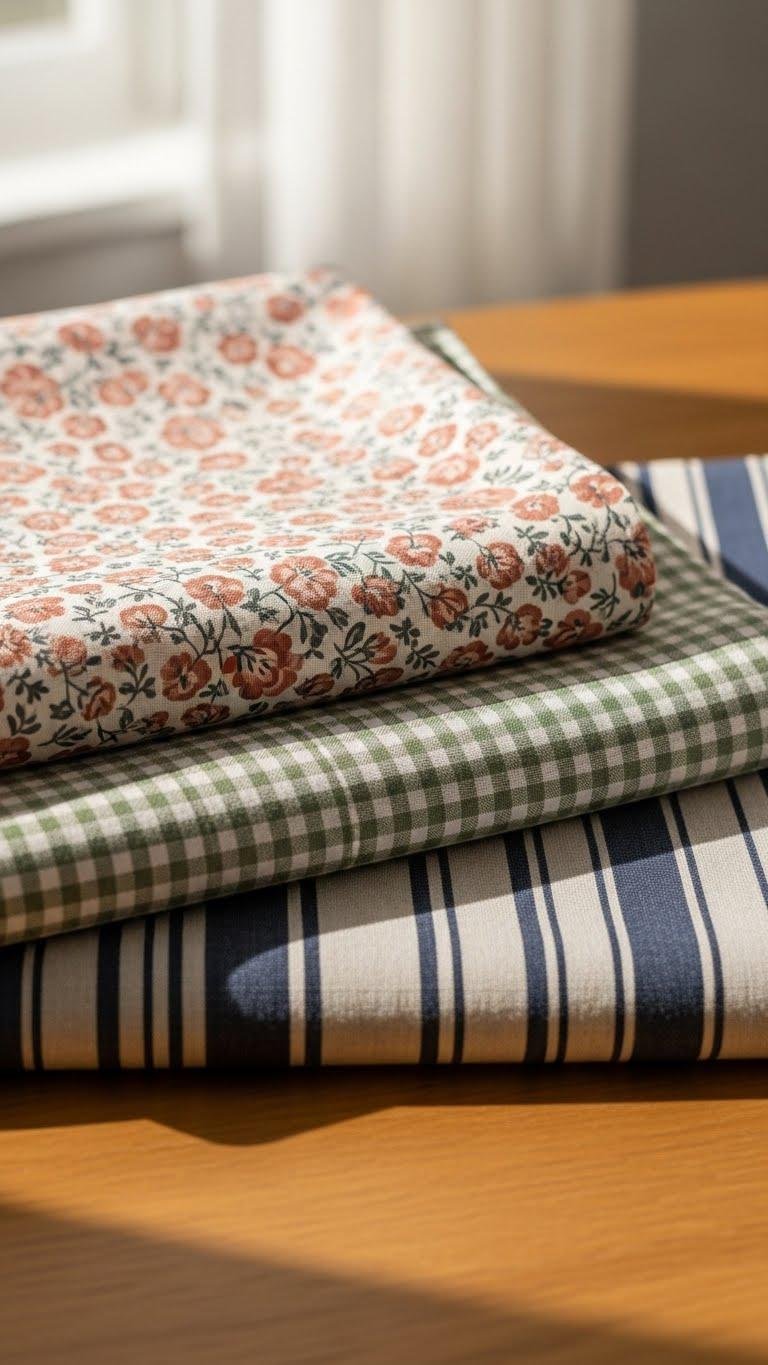 You can carry the soft, layered feeling from linens into pattern by sticking to a tight palette and mixing florals, gingham, and stripes for a fresh, modern look. You’ll balance vintage ditsy prints with bold stripe lines and gingham texture, keeping to a muted palette so compact arrangements read cohesive. Choose scale, repeat, and negative space to let each pattern breathe.
