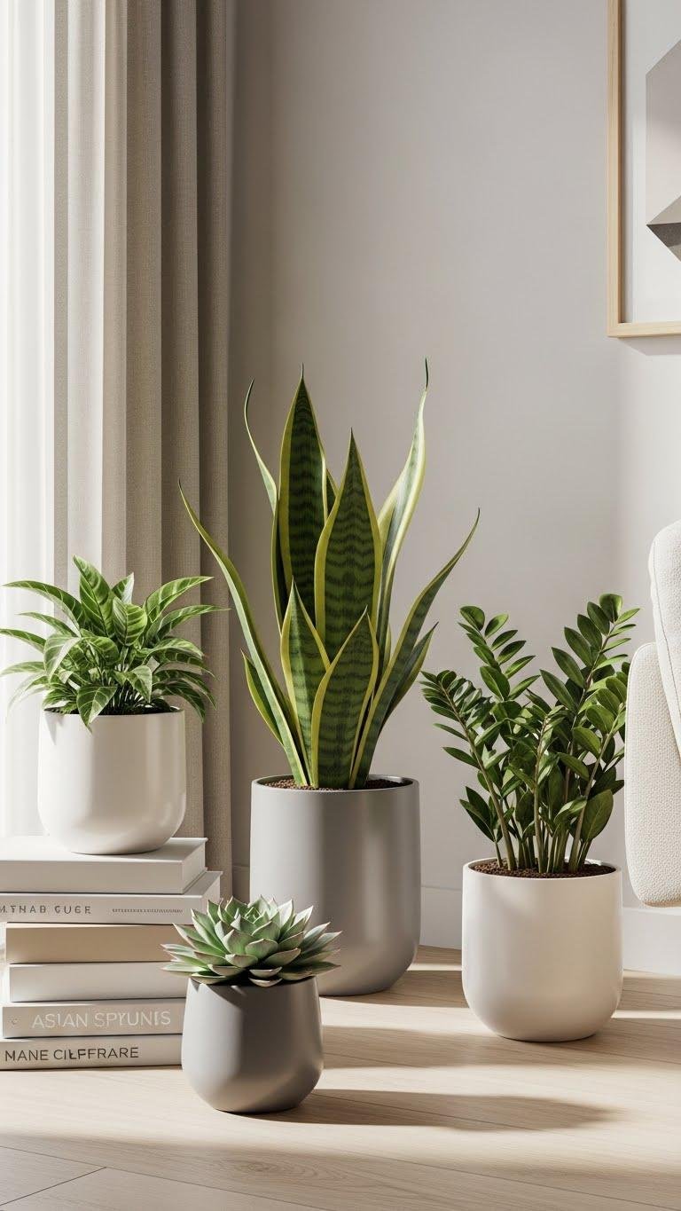 Bring in a few hardy plants to instantly lift the mood and soften sharp lines without demanding green-thumb skills. Choose low light succulents, snake plants, or ZZs in sculptural pots to add calm, modern texture. Use self watering pots for worry-free weekends and busy days. Arrange sparingly so each piece breathes, letting natural light and clean lines keep your apartment feeling open and free.