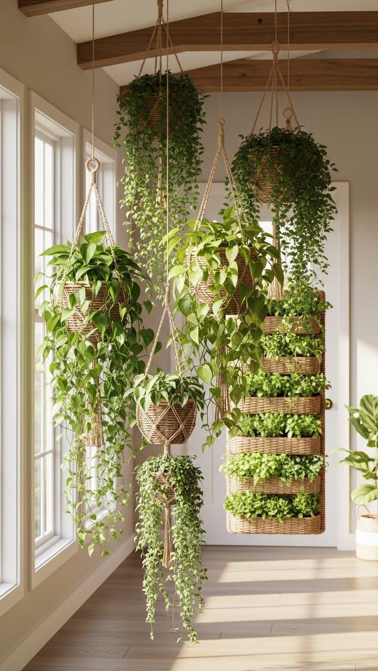 If you liked the vertical drama of stacked pots, hanging baskets give you similar height without stealing floor real estate. You’ll free up walking space while layering texture with macrame planters and woven wire baskets. Suspend trailing philodendrons, ferns, or compact vertical herbbeds to create a floating garden. It’s a bold, airy trend that maximizes room and invites movement.