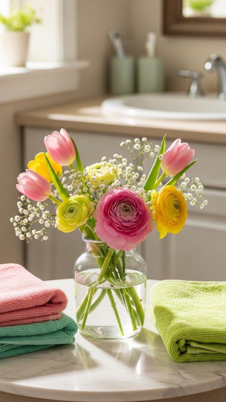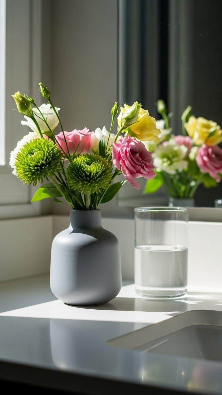 A small vase of seasonal blooms instantly lifts your vanity, bringing color, scent, and a touch of nature into the bathroom without overwhelming the space.