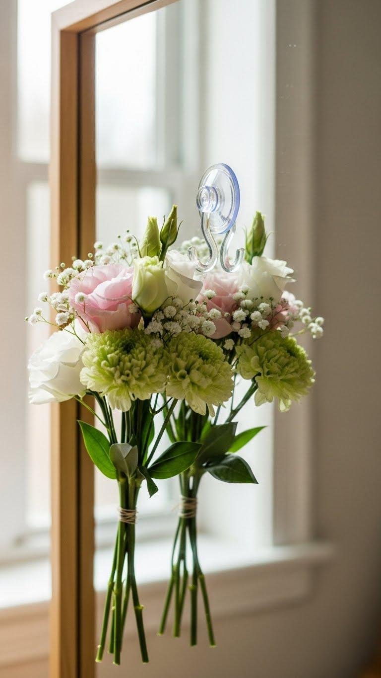 You’ll attach a small bouquet with a clear suction hook, letting mirror greenery frame your reflection without clutter.
