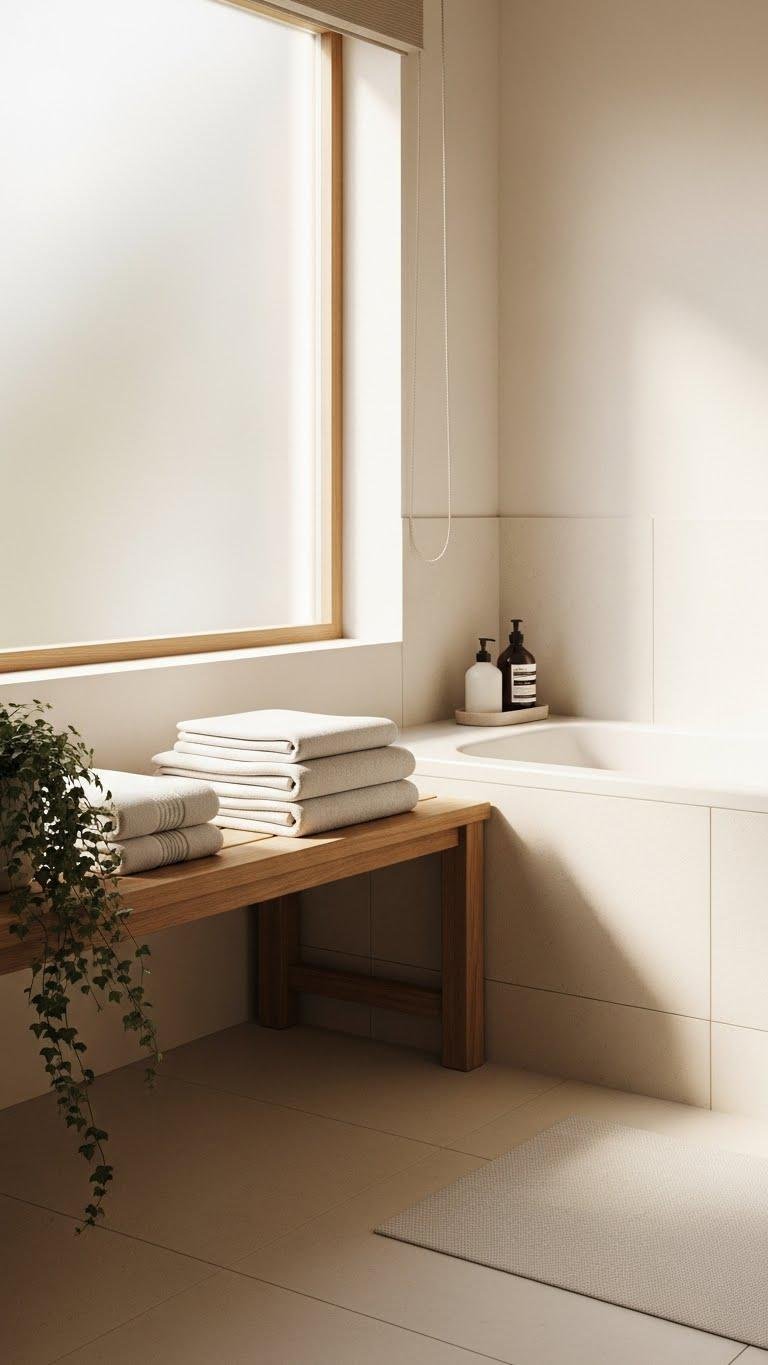 Slip into the calm of a built-in bench that anchors your bath with both function and poise. You’ll store plush towels within reach, creating a spa-like rhythm that invites relaxation. Keep greenery placement simple: a single potted fern or trailing ivy on one end softens lines and breathes life. Choose durable materials and clean lines so the space feels open, free, and effortlessly curated.