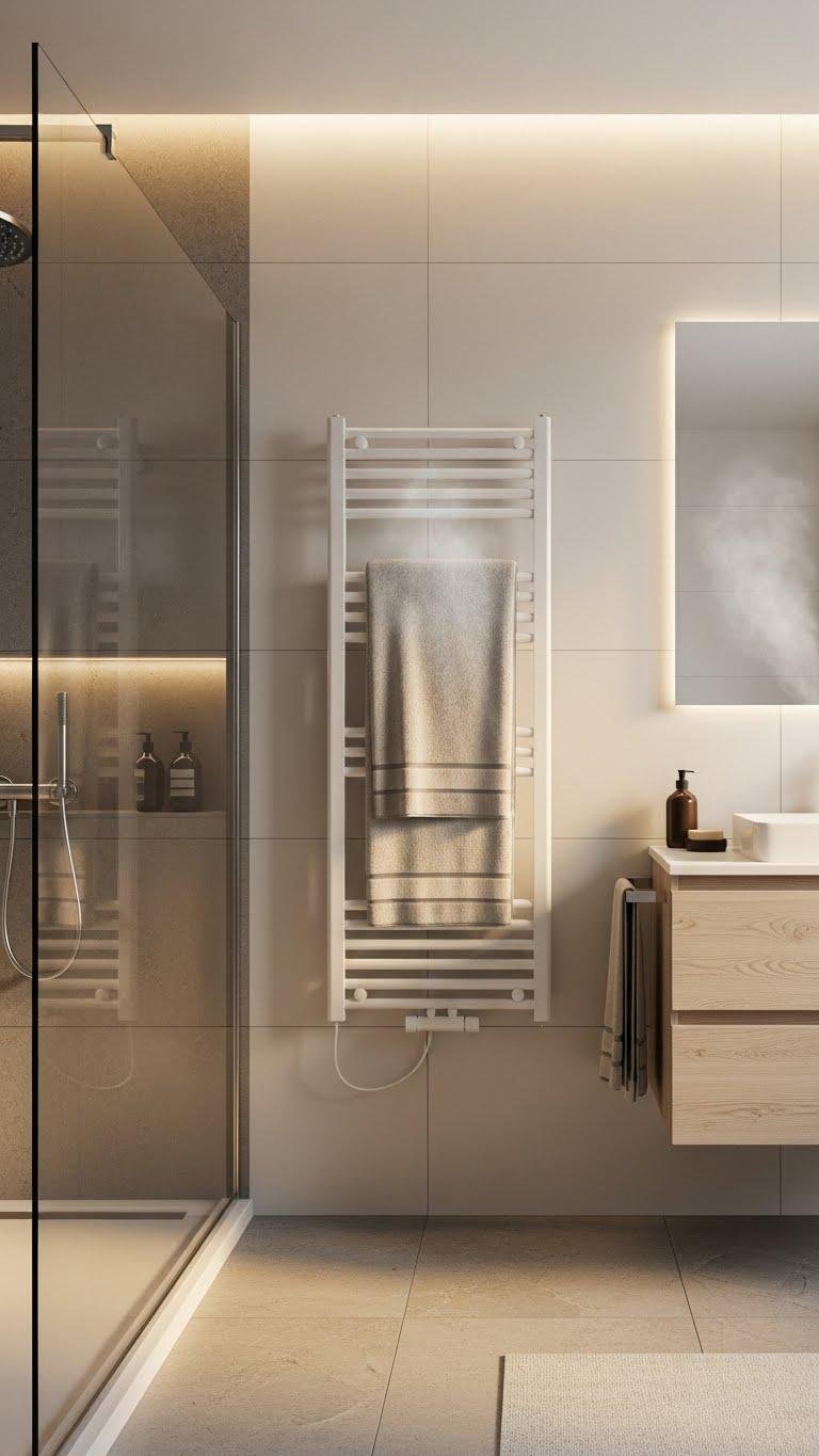 Choose towel warmer placement near the shower or vanity for easy reach without crowding sightlines. Pick a minimalist finish to keep the space airy and let you move freely in a calm, uncluttered bath.