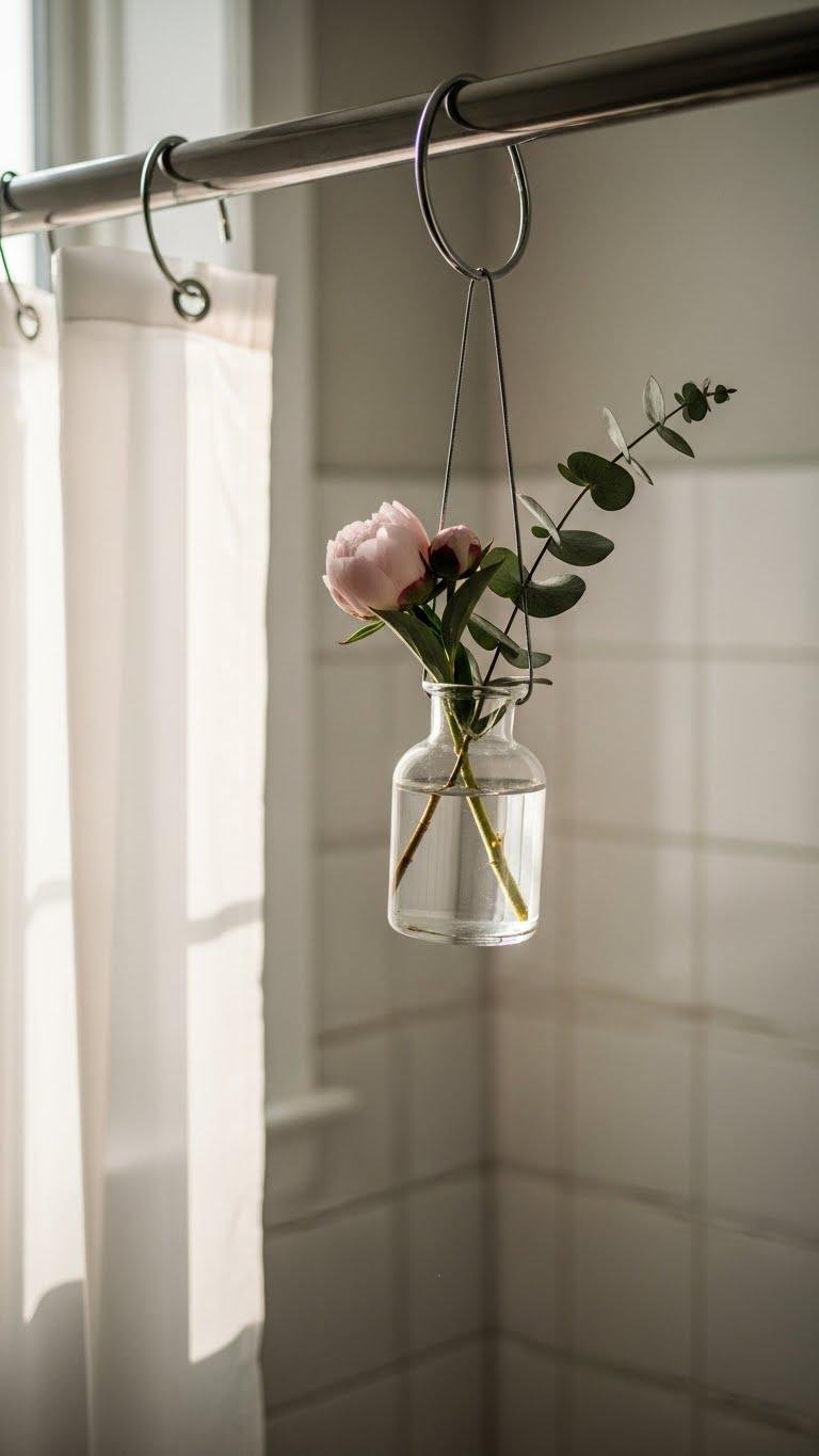Hang a tiny bud vase from the shower curtain rod to introduce an effortless, bloom-forward accent that won’t take up counter space. You’ll create a minimalist placement that feels airy and free — clip or loop a slim holder, add one or two delicate blooms, and enjoy fresh scent without clutter. It’s practical, visual, and quietly liberating.