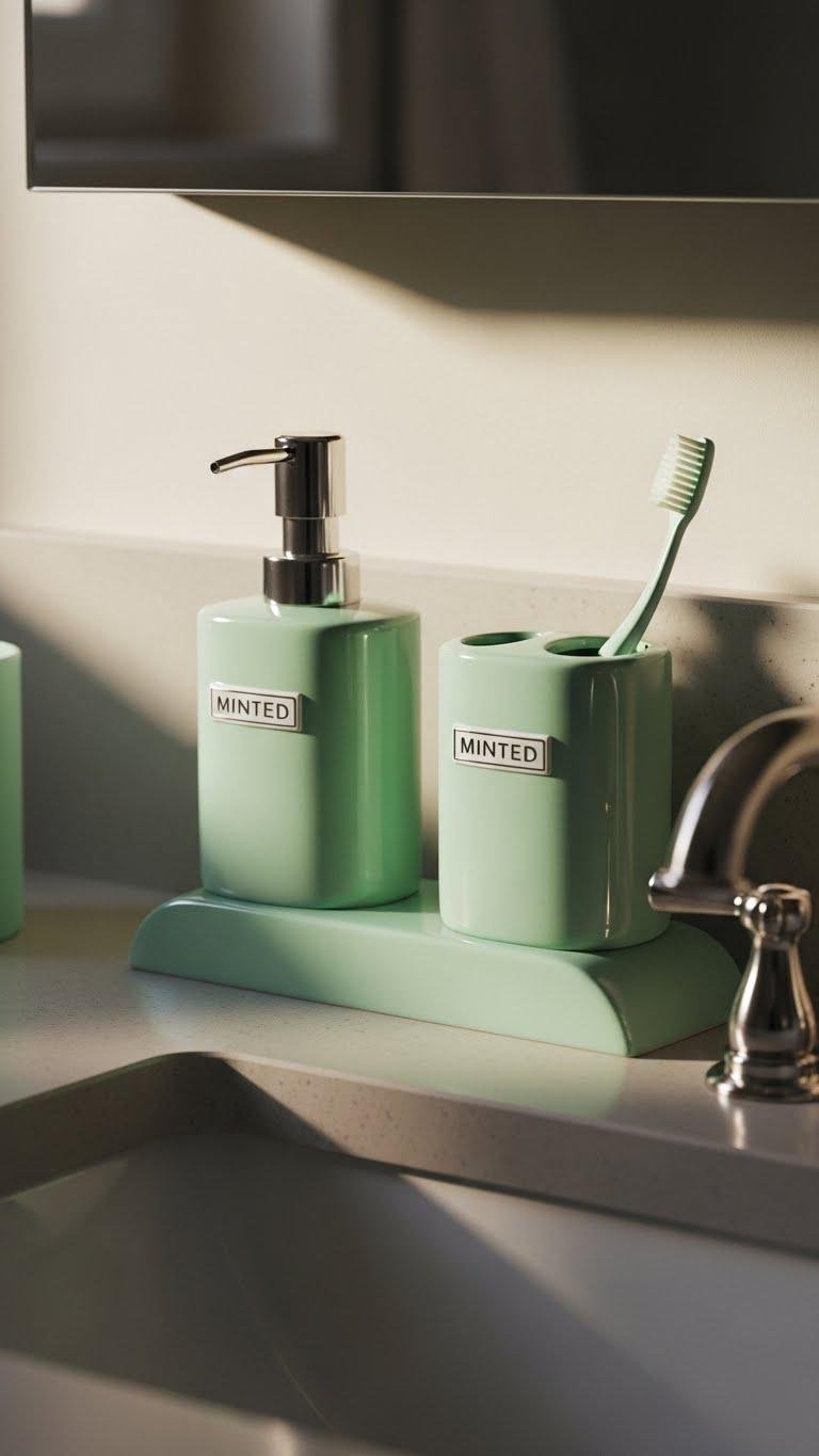 Pair a mint green soap dispenser with a matching toothbrush holder to give your sink area a calm, cohesive focal point that reads fresh without fuss. Choose pieces with retro ceramics curves and subtle minted typography labels to blend vintage charm with modern simplicity. You’ll keep surfaces uncluttered, swap colors easily, and enjoy a small freedom: a peaceful, portable touch that lifts your morning routine.