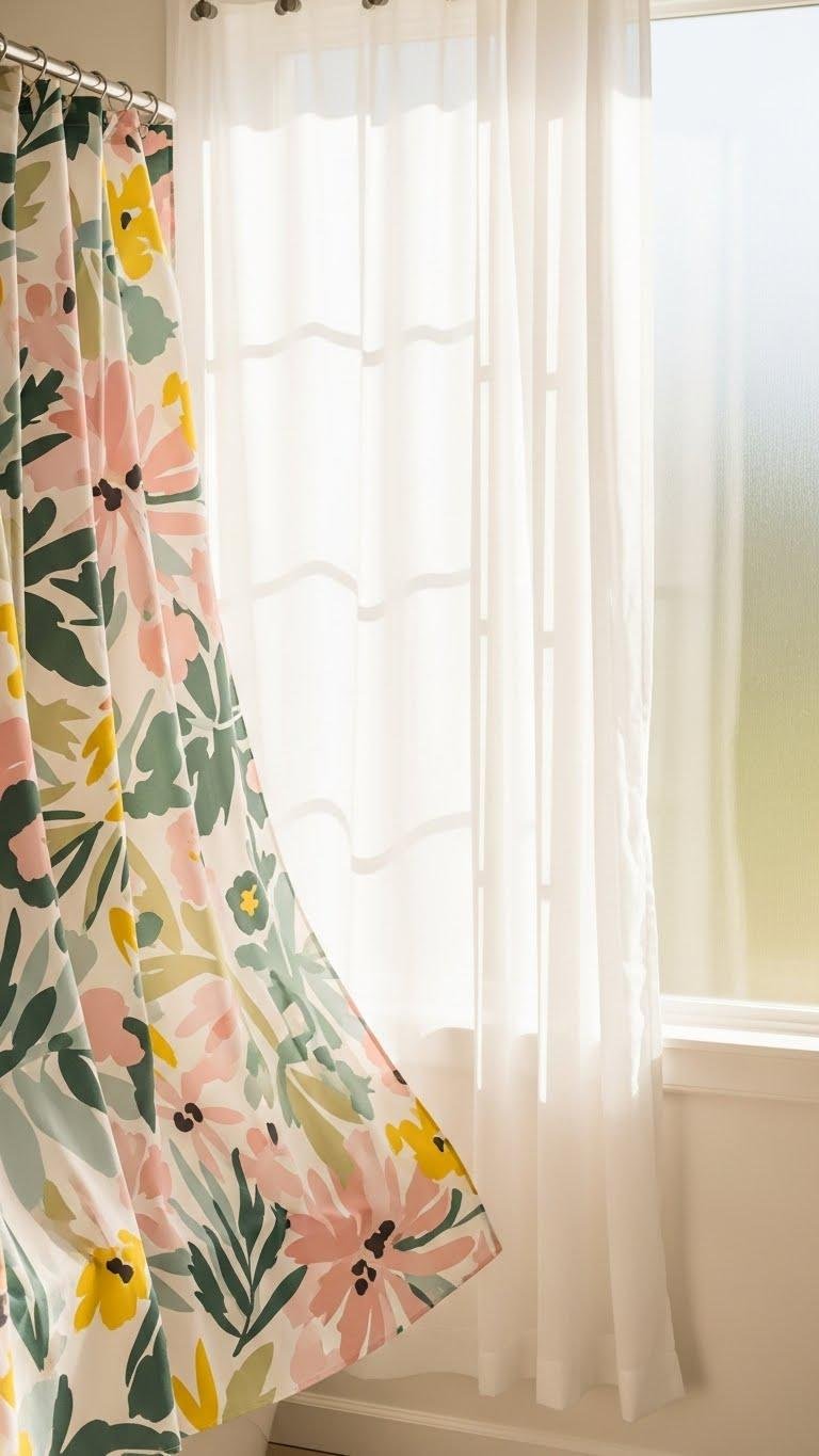 A floral shower curtain can instantly lift the room’s mood by introducing color, pattern, and movement without a major remodel.