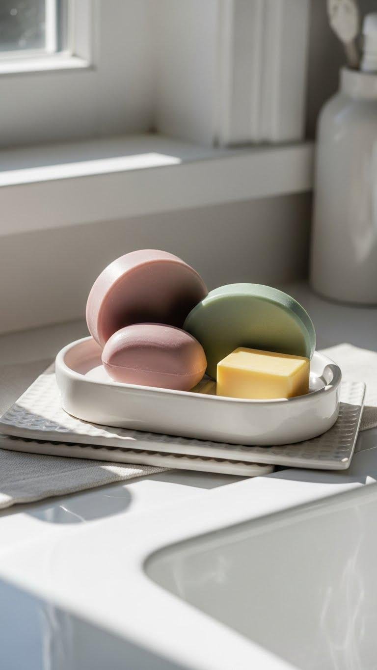 Set a pastel soap dish near the sink and arrange 2–3 scented bars with varied shapes and muted hues to make a small, fragrant still life that doubles as decor. You’ll use color coordination to tie the dish to the room, alternate sizes for visual rhythm, and introduce layered textures with a linen mat or ceramic tray. It’s effortless, fresh, and freeing.