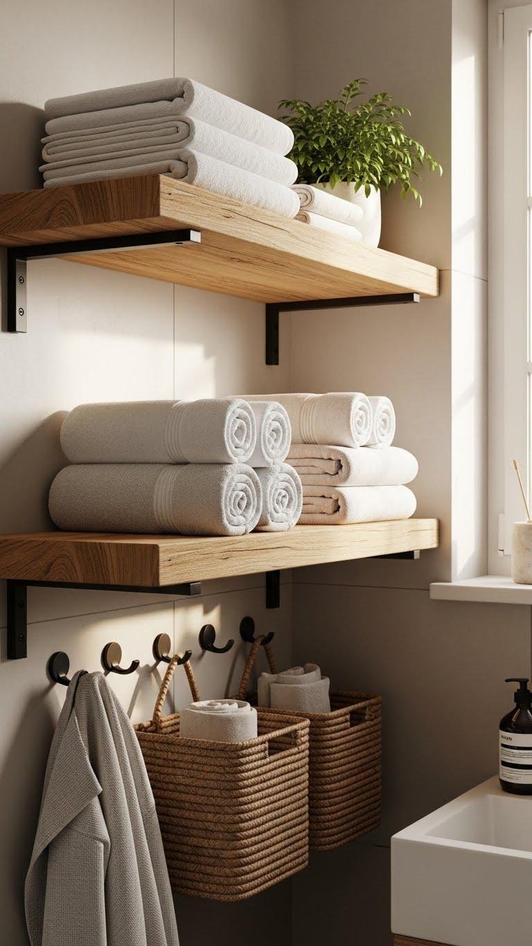 Use towel layering on open shelves and hooks for casual luxury; mix sizes and tones so you can refresh the mood anytime without clutter or fuss.