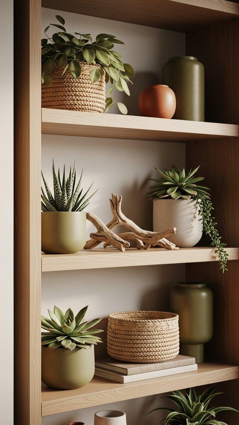 When you style open shelves with plants and natural objects, you create an instant sense of calm and curated warmth that makes the whole room feel more lived-in.