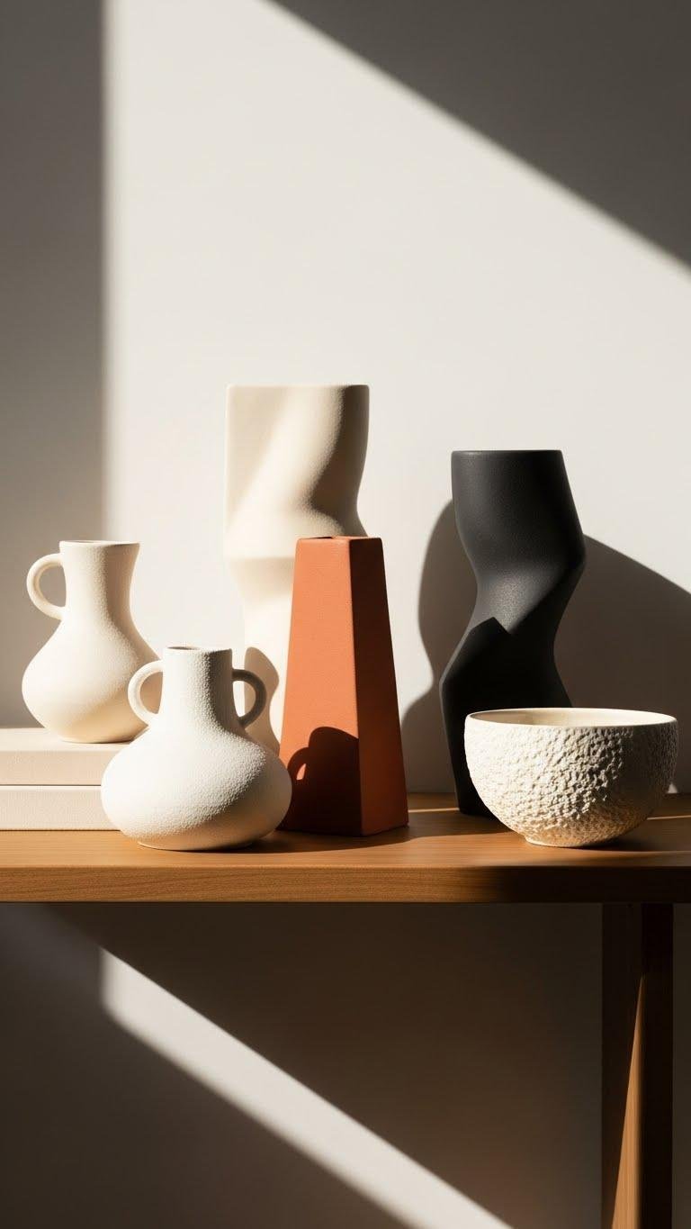Move from living greenery to objects that sculpt space: choose vases and accents that read like small-scale art.