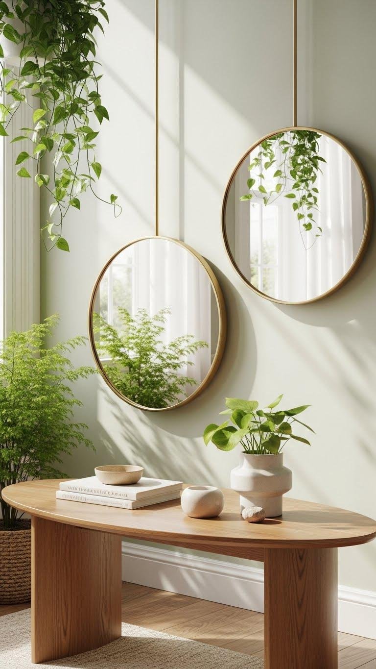 After layering greens for texture, bring gentle curves into the space with round mirrors and oval side tables to keep the room feeling fluid and relaxed.