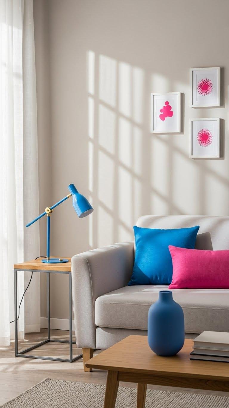 Brighten a muted palette with tiny jolts of electric blue or hot pink to give the room instant energy without overpowering its calm. Use electric blue accents on a cushion, lamp, or vase and scatter hot pink pops in small art frames or a throw pillow. You’ll create moments of bold freedom that feel intentional, modern, and effortlessly playful.