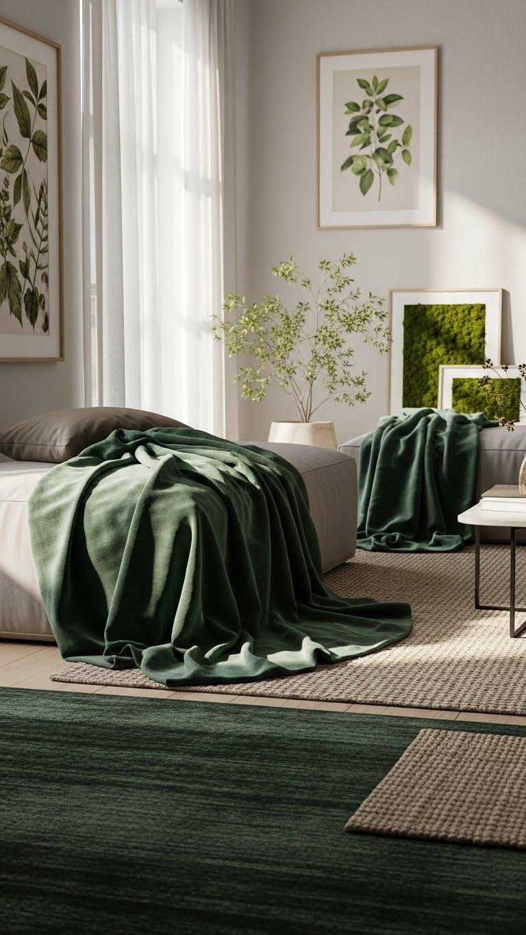 Choose a plush velvet throw for instant drama, pair it with botanical prints to amplify natural vibes, and hang subtle moss artwork to echo texture.