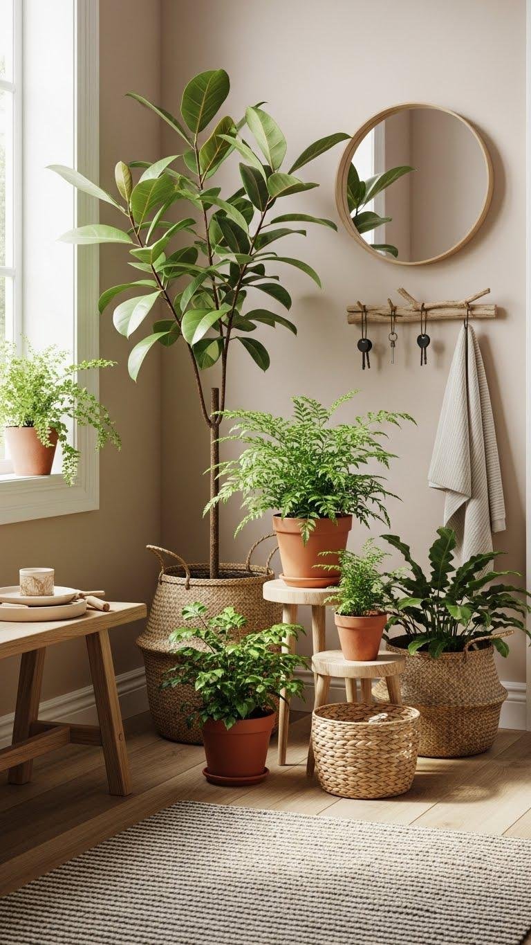 Welcoming visitors starts with layering living elements—place a tall sculptural plant like a fiddle leaf or monstera to anchor the space, then add smaller pots, woven baskets, and a wooden bench to create a tactile, organic tableau.