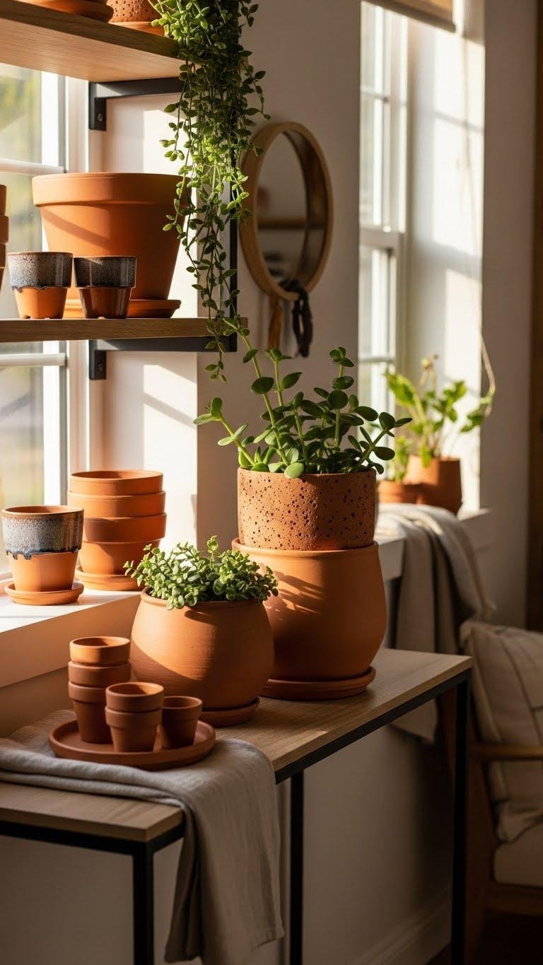 Warm up your spring scheme with terracotta accents and clay planters that add earthy texture and sun-kissed color without shouting for attention. You’ll mix handmade terracotta pots with a few glazed miniatures for contrast, placing them on shelves, windowsills, and console tables. Let plants breathe in clay’s porous warmth, creating a relaxed, liberated vibe that still feels intentional and modern.