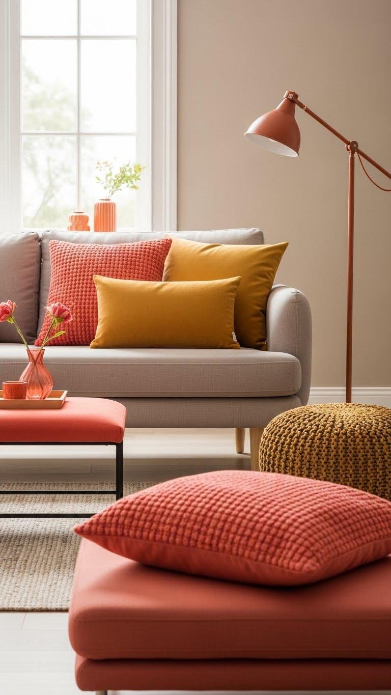 Brighten up your sofa by swapping in coral and mustard pillows that instantly lift a neutral palette without overpowering it. Mix textured coral pillows with a low-profile coral ottoman for playful contrast, and balance with a woven mustard pouf nearby. You’ll keep the room airy, confident, and effortless — a fresh, liberated vibe that’s easy to change with the seasons.
