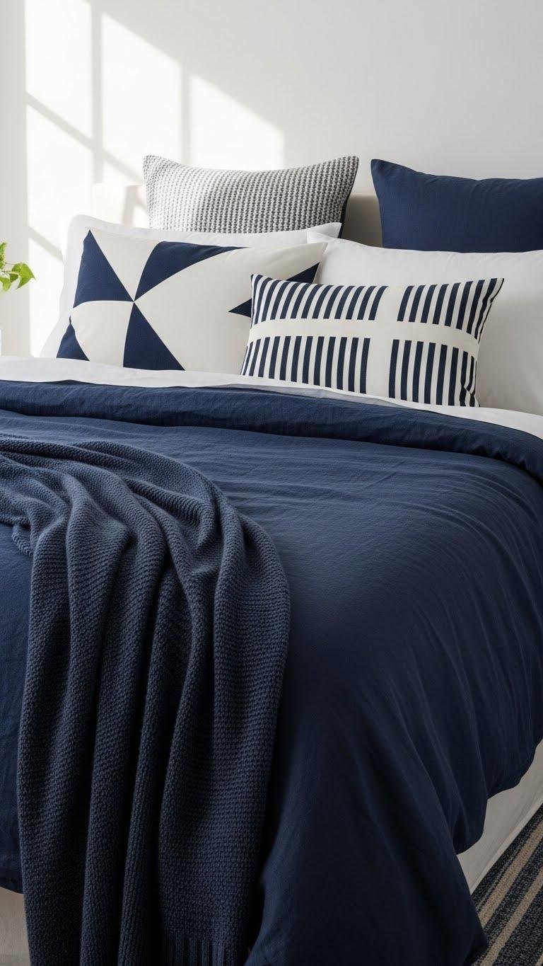 If you want a bold bedroom pivot, layer indigo with high-contrast patterns to give plain linens instant personality.