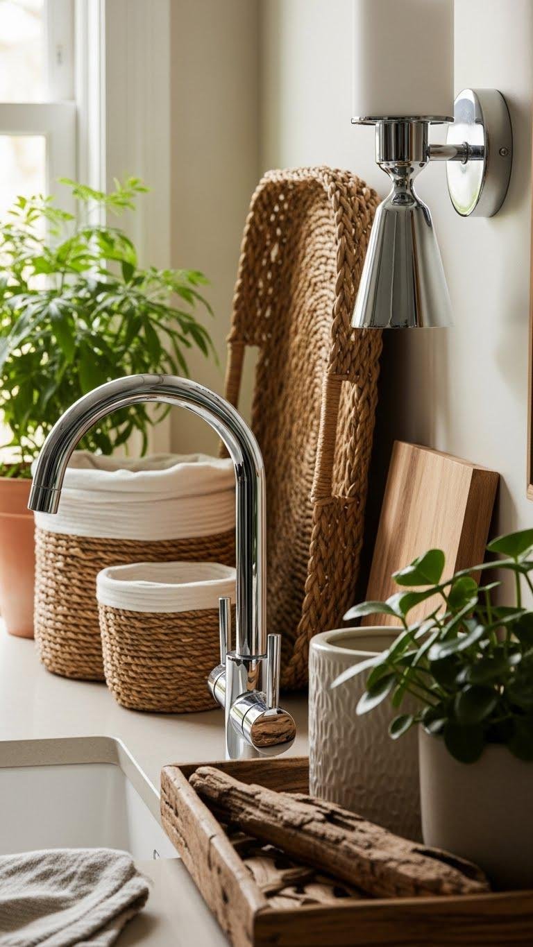 A sleek chrome faucet or lamp can feel cool and clinical until you pair it with warmth from organic accents like woven baskets, driftwood trays, or live greenery—do that and the metal suddenly reads modern and inviting.