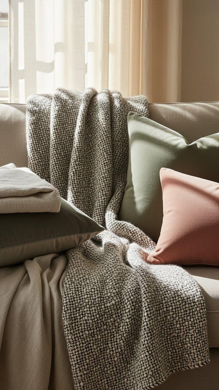 Mix slubby boucle throws, tactile velvet pillows, and linen for contrast; keep patterns minimal.