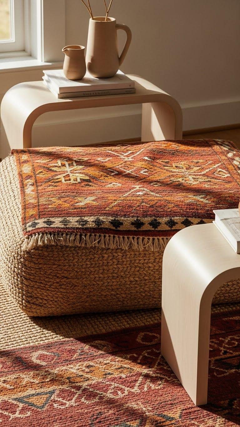 Sculptural tables set the stage; now layer rugs to ground that sculptural drama and add warmth underfoot. You’ll combine an earthy kilim with a neutral, layered sisal for texture contrast and visual depth. Place the kilim slightly off-center over the sisal to define seating, anchor movement, and let each piece breathe. This approach feels free, tactile, and effortlessly curated.