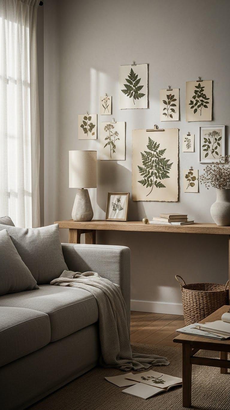 You’ll choose pressed botanicals and raw paper prints to add honest, tactile detail without clutter.