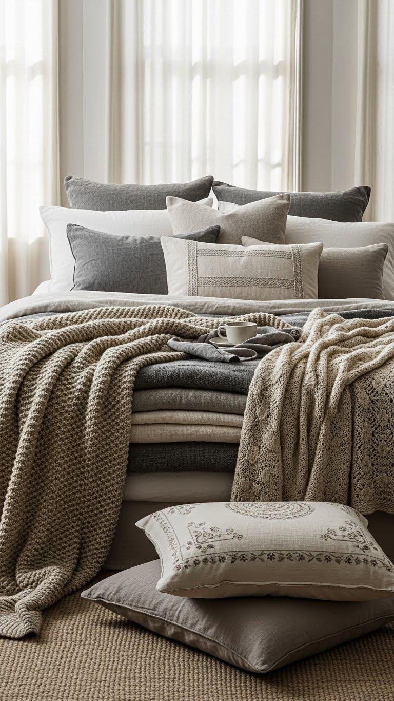 Layer soft wool throws and plush pillows to turn a neutral bedroom into a tactile haven that invites lingering. You’ll mix calming neutrals with subtle texture, curate heirloom textiles for warmth, and choose breathable fibers that age beautifully.