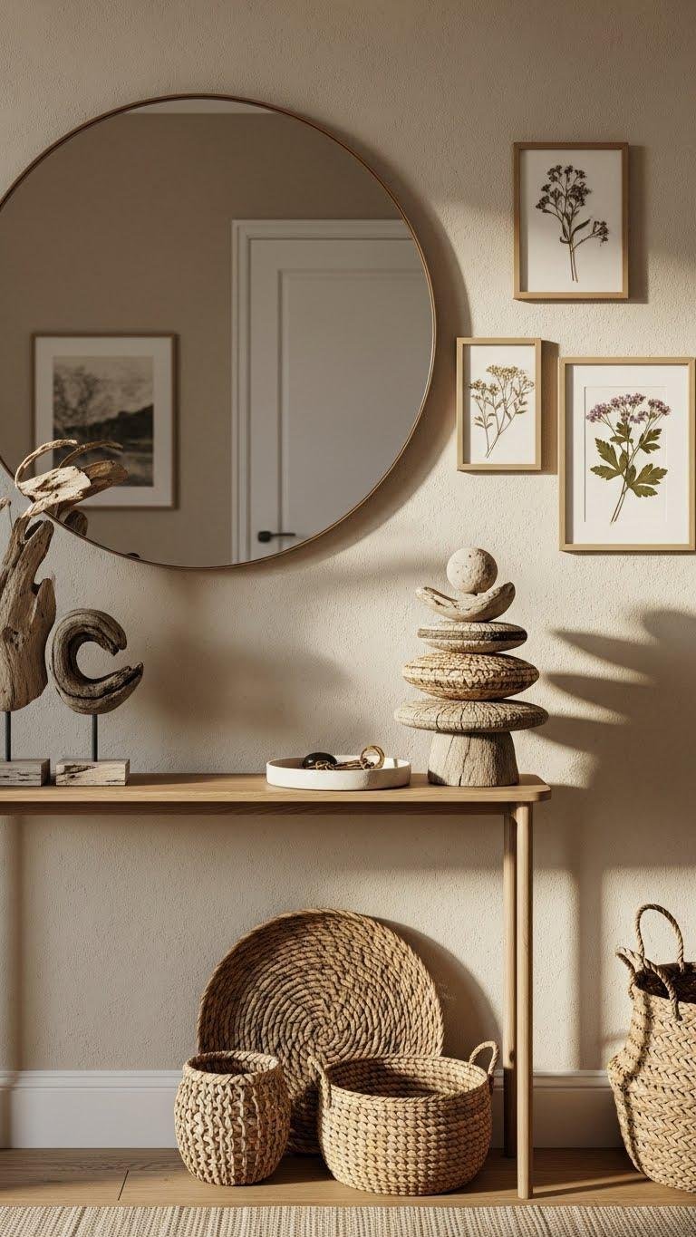 Rounded mirrors warm a room’s geometry; collected natural pieces make the entry itself feel lived-in and welcoming. You’ll layer driftwood displays, woven baskets, and a slim console to catch keys without clutter. Lean pressed flower frames against the wall for delicate texture and effortless personality. Choose muted tones, tactile materials, and open space so you can come and go freely, uncluttered and calm.