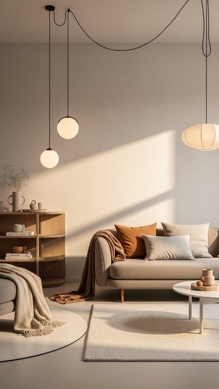 Choose a low-profile sofa with gentle arcs, pair it with curved lighting to soften corners, and add rounded shelving for airy storage.
