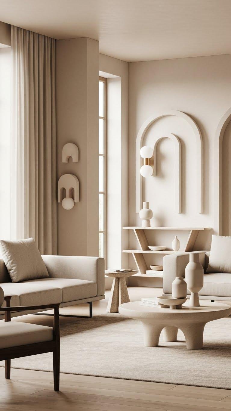 You’ll balance restraint and soul by adding matte ceramic vases, a sculpted coffee table, and arched sconces to soften corners. Keep palettes neutral, let negative space breathe, and choose pieces that feel liberating.