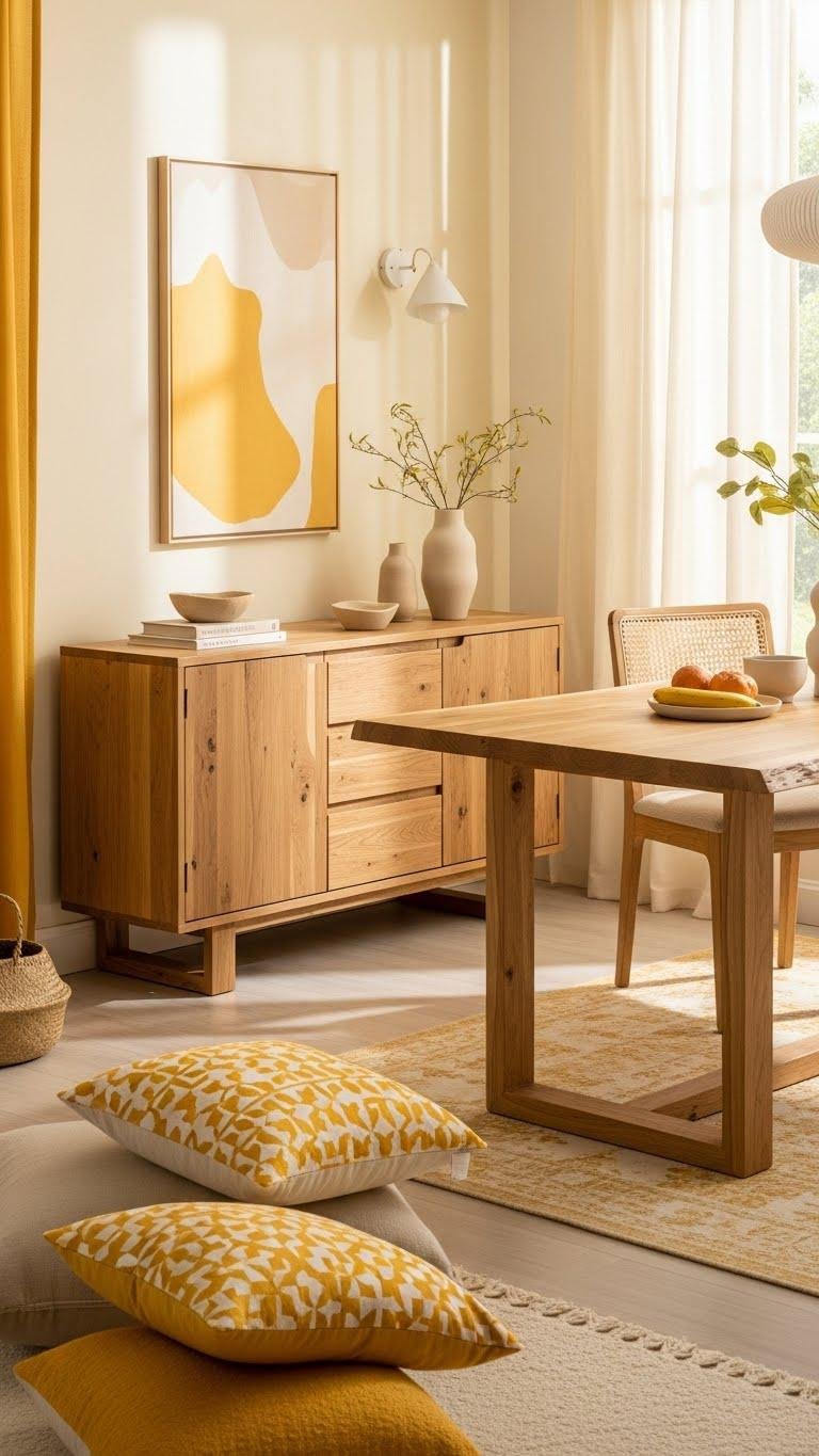 After you’ve grounded a room with a natural wood statement piece, soften the light and mood by swapping stark bright white for warm, creamy yellows that play nicely with wood tones.