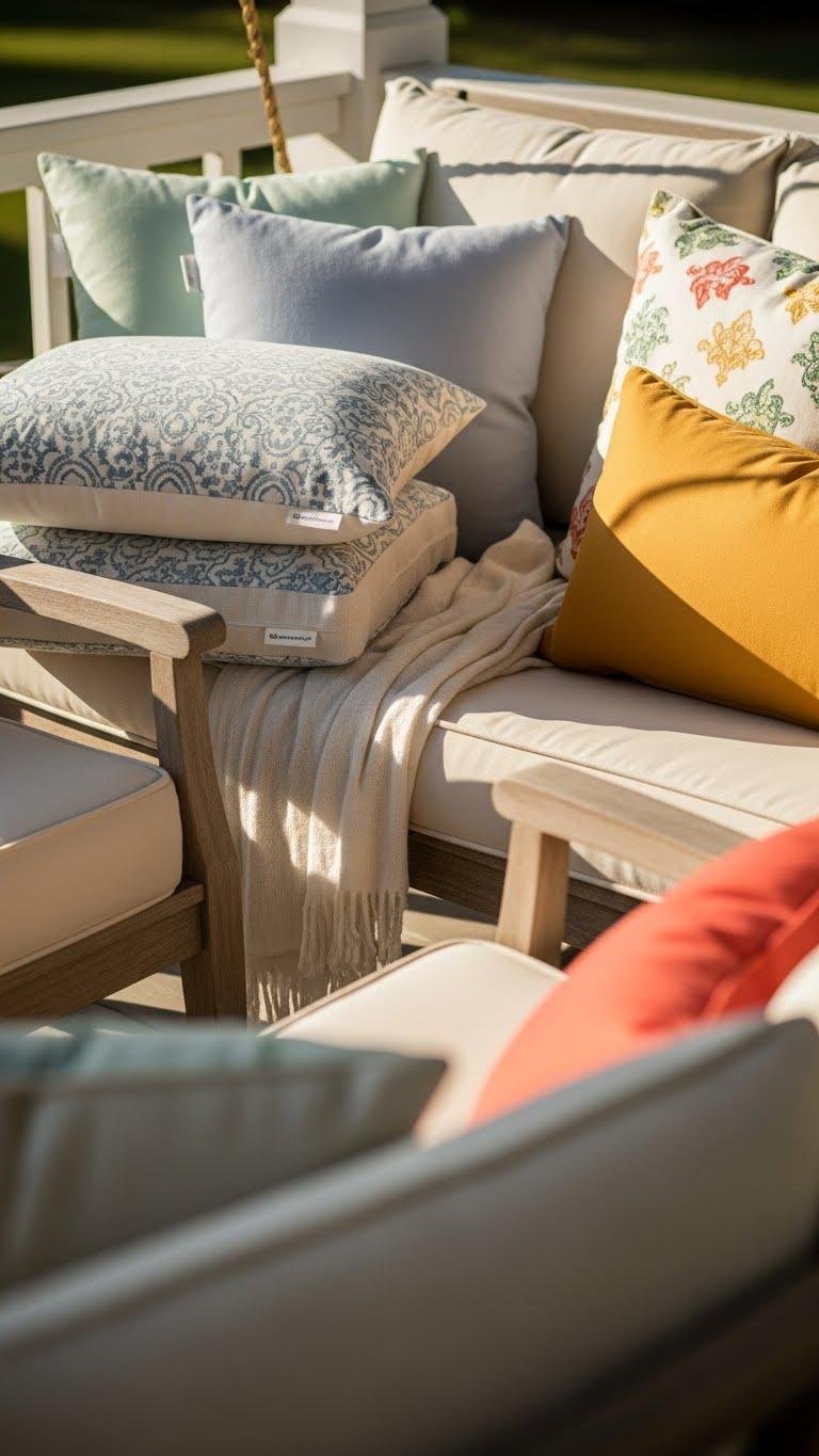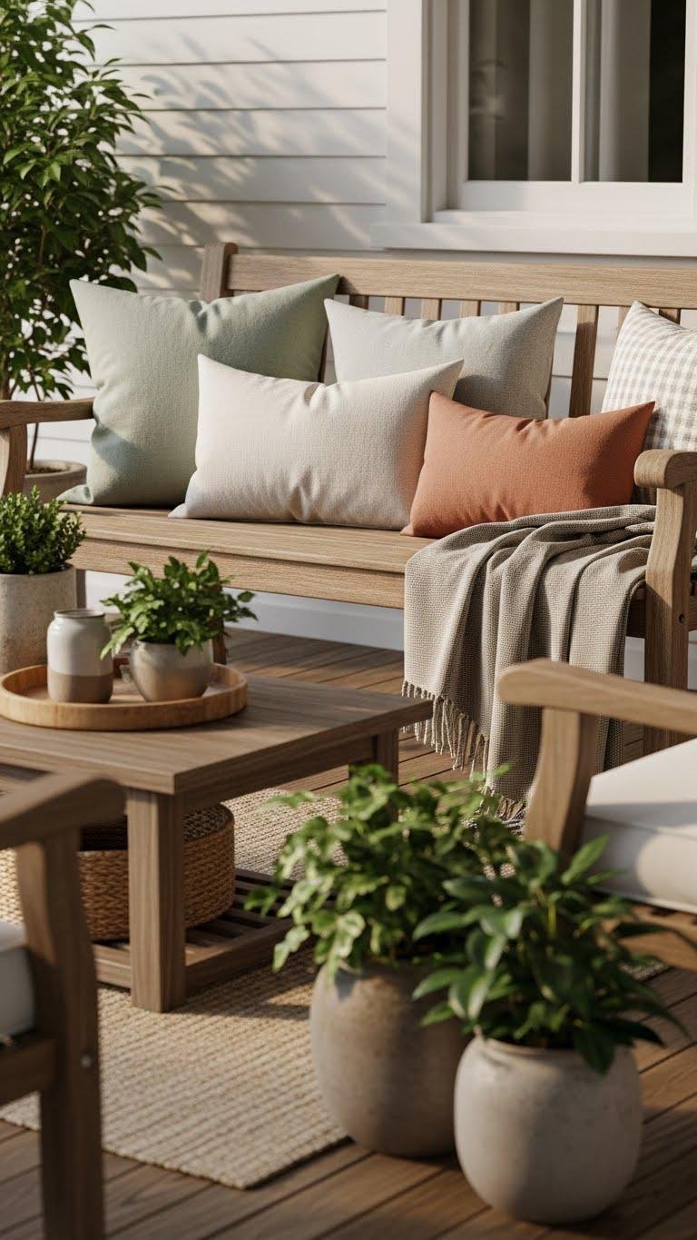 You’ll craft a relaxed, airy scene with layered throw pillows and a simple pillow rotation to refresh mood and color. Position plants and a low table so you can spark bench conversation, sip coffee, and claim outdoor freedom without fuss.