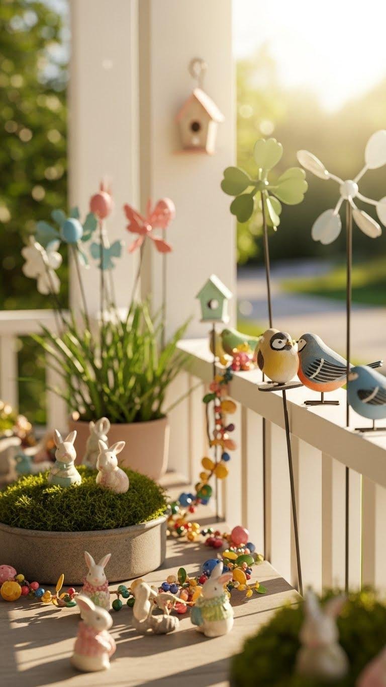 When you sprinkle seasonal figurines and whimsical accents across your porch, they immediately lift the mood and give guests something to smile at; think tiny ceramic bunnies tucked into potted moss for spring, painted wooden birds perched on a railing, or metal garden stakes with playful shapes that catch the breeze.
