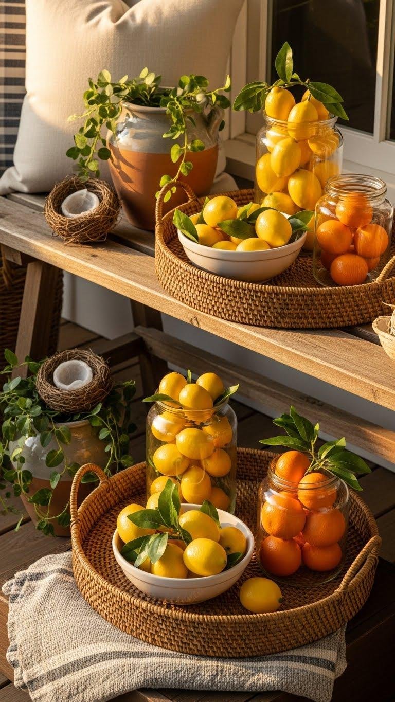 Bring in a few themed props—like clusters of faux fruit or a couple of delicate bird nests—to anchor your porch’s seasonal story and make it feel thoughtfully curated. You’ll mix faux citrus in bowls, woven trays, or glass jars, and tuck curated nest displays among planters.