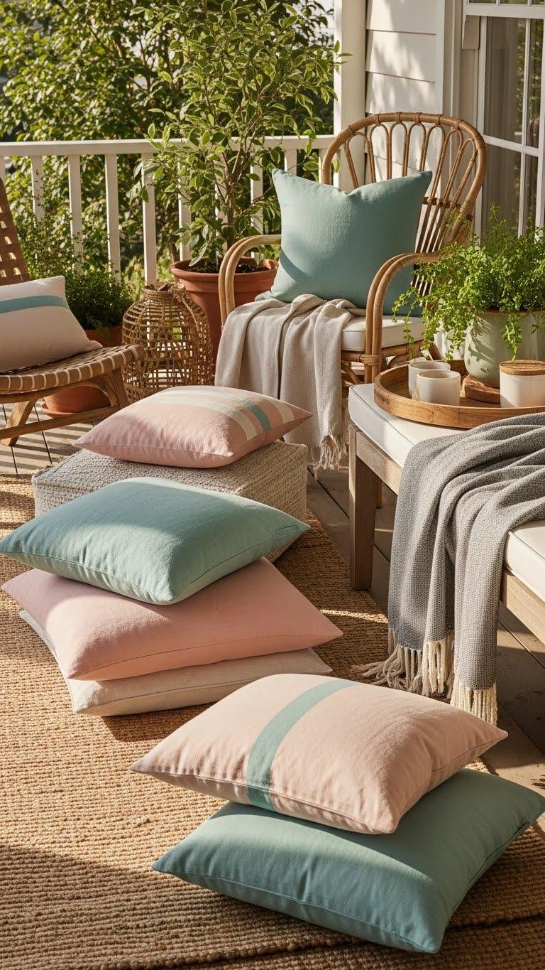 Mix pastel patterns with solid hues, add linen textures for breathable comfort, and stack cushions in varying sizes so seating invites lounging.