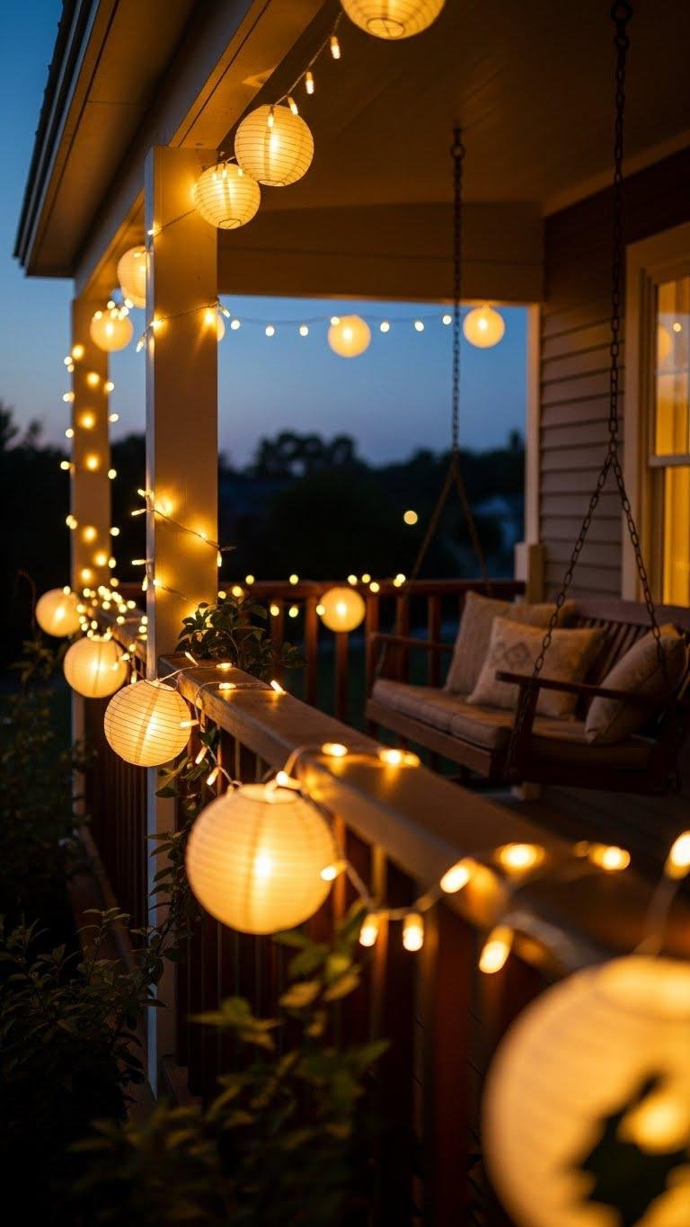 String lights instantly lift a porch from pretty to magical, and choosing solar or battery-powered options keeps that glow easy and eco-friendly. You’ll love warm white LEDs for a soft, timeless vibe, and stringing solar paper lanterns adds playful texture without cords. Drape them over railings or a swing, set timers, and enjoy a liberating, low-effort evening ambiance.