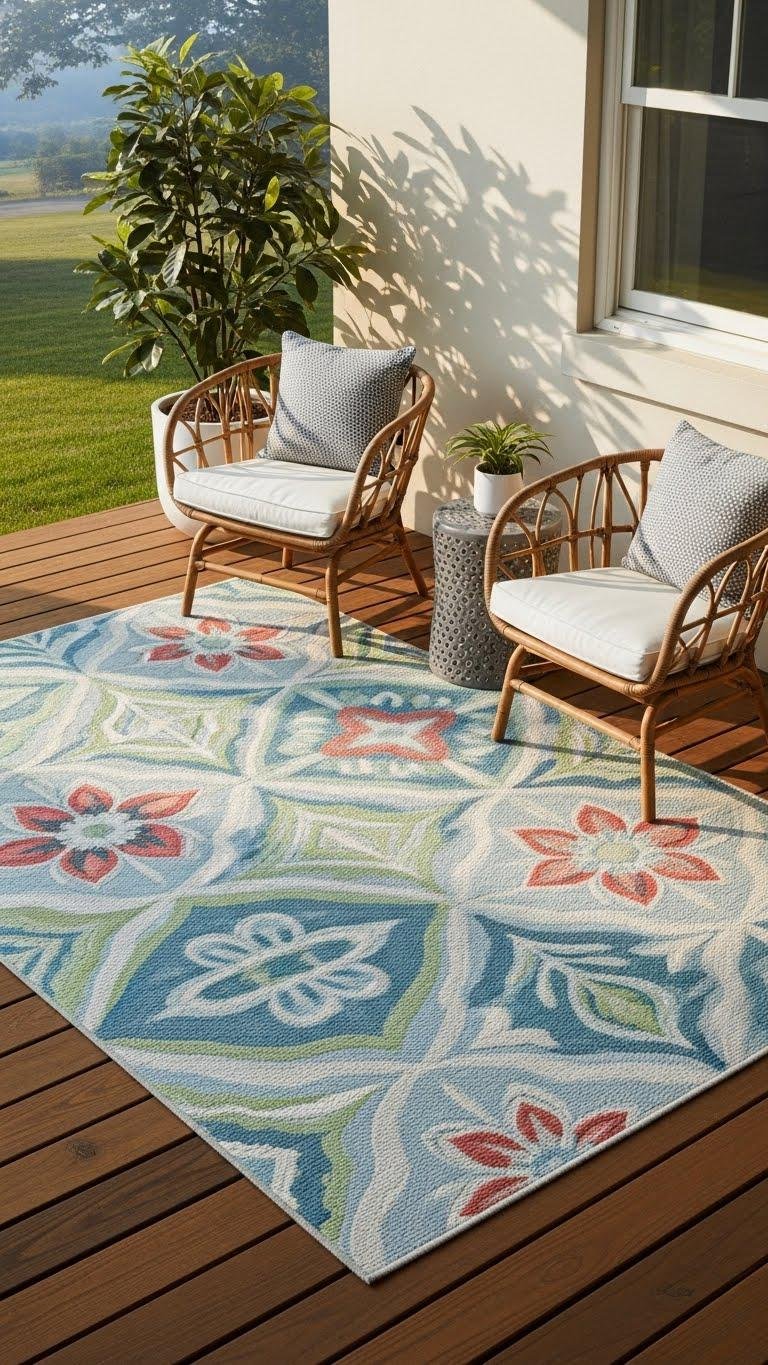 After you’ve set up a cozy two-chair chat spot, anchor that area with an outdoor rug to give it a clear visual boundary and a finished look. Choose a seasonal pattern that nods to spring — bold or breezy — and orient the rug to guide traffic flow. A well-placed rug defines zones, invites lounging, and keeps your porch feeling open and free.