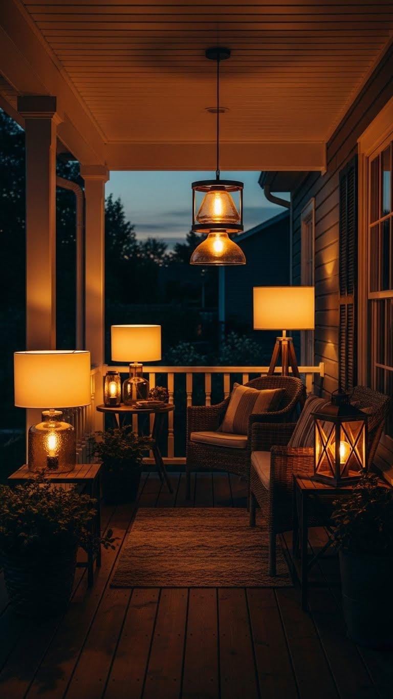 A handful of well-placed accent lights—table lamps, pendant shades, or small hanging fixtures—can instantly define your porch’s mood and usable hours.