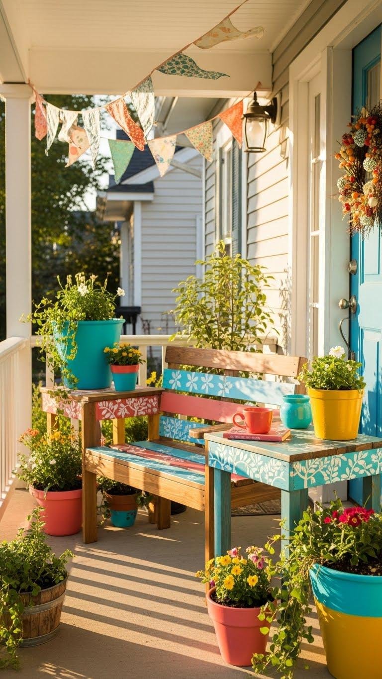 You’ll upcycle furniture with bold stains or stencils, craft painted planters for instant color, string fabric buntings for carefree movement, and swap seasonal wreaths to match moods.