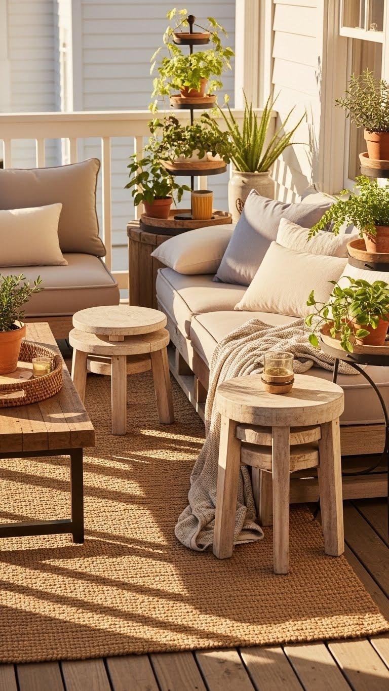 Mix stacked stools as casual side tables, a low coffee table for lounging, and tiered plantstands to lift greenery at different levels. You’ll create easy reach for drinks, layered vignettes, and a breathable, free-spirited porch that invites lingering and spontaneous gatherings.