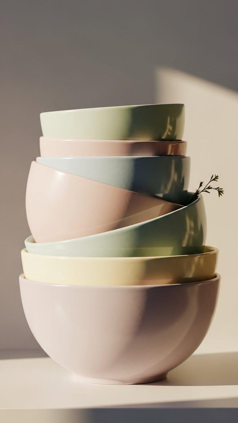 Let a soft pastel bowl or vase act as a single accent amid books and ceramics. Choose muted geometry and tactile linen textures nearby to keep the look curated, airy, and effortless so you can move through the season freely.