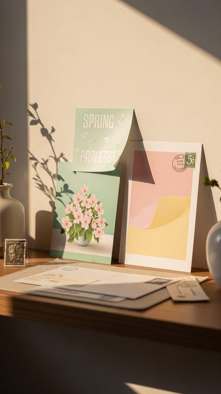 You’ll enjoy rotating prints that nod to spring — breezy scenes, a curated stamp or delicate mail art — swapping pieces often keeps the shelf airy, democratic, and effortlessly yours.