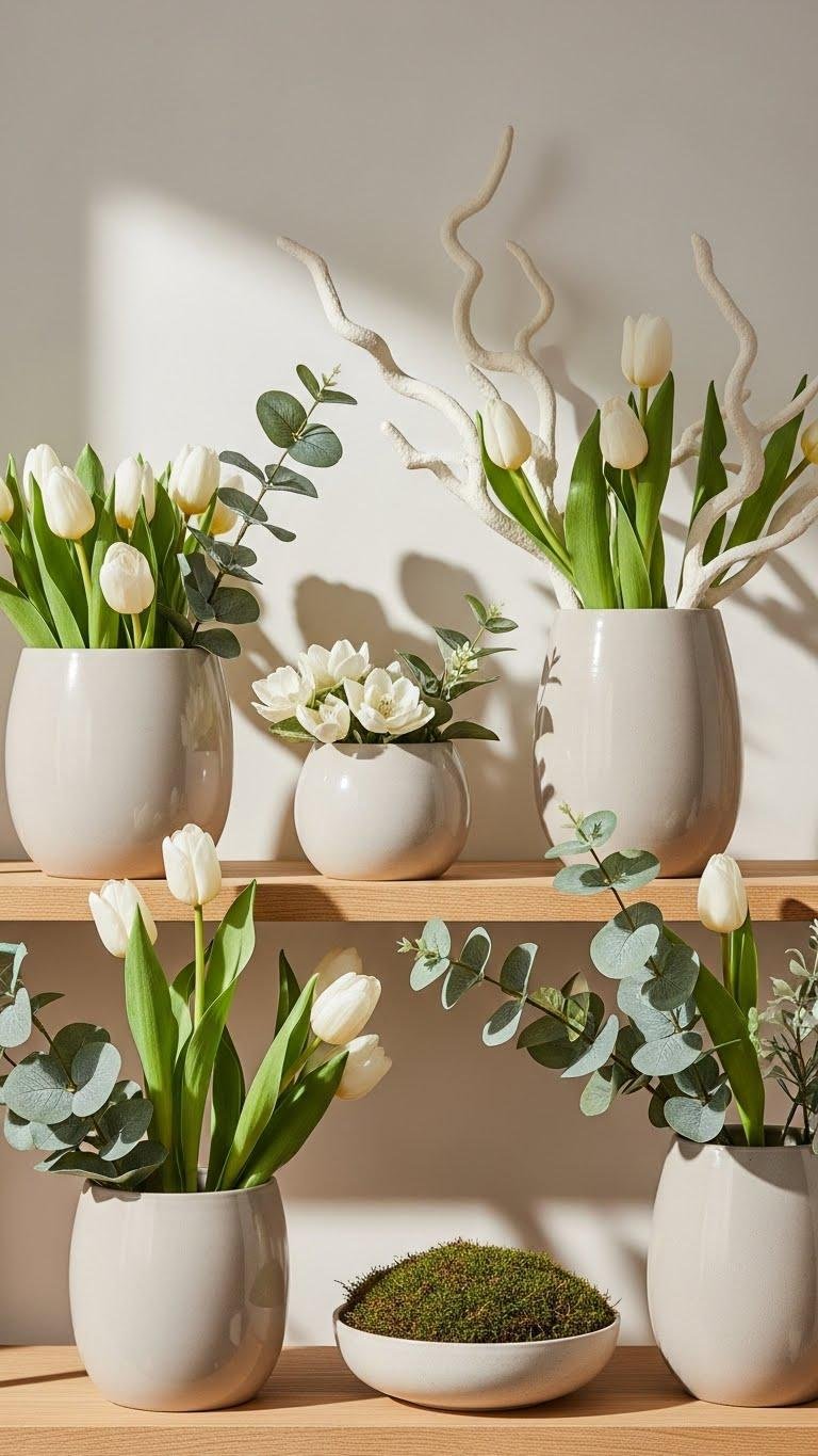 Often you’ll want both the ease of faux and the liveliness of fresh foliage on a shelf, so pair a few real stems—like fragrant tulips or sprigs of eucalyptus—with sculptural faux branches in matching neutral pots. Let live moss cushion a small bowl, balance faux eucalyptus in a taller vessel, and arrange gaps so each piece breathes, giving your shelf a light, free seasonal vibe.