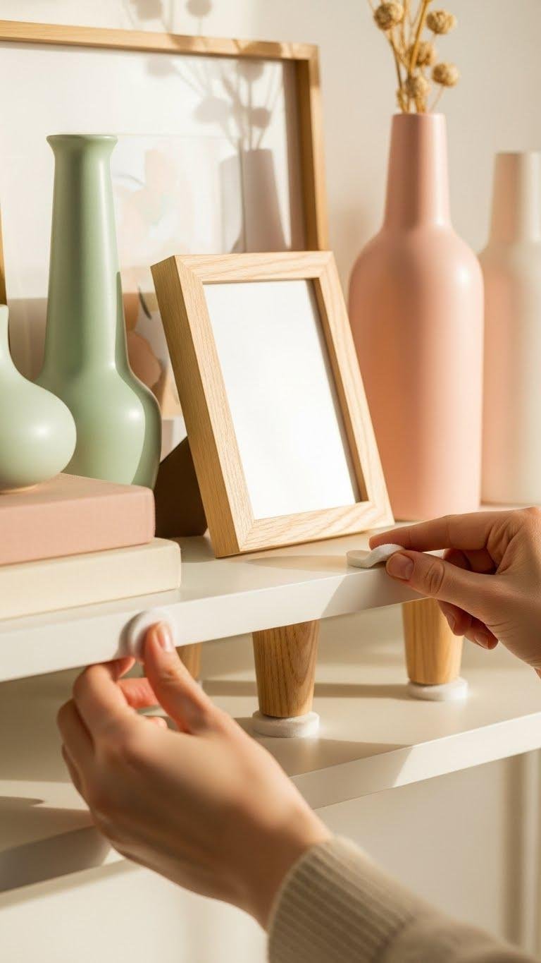 Bring out protective felt pads so you can change up your spring vignettes without worrying about scratches. Stick adhesive circles beneath vases, frames, and furniture feet to glide pieces easily and protect wood. You’ll swap items freely, mix textures, and keep surfaces pristine. It’s a light, curated trick that keeps your shelf styling spontaneous and carefree all season.